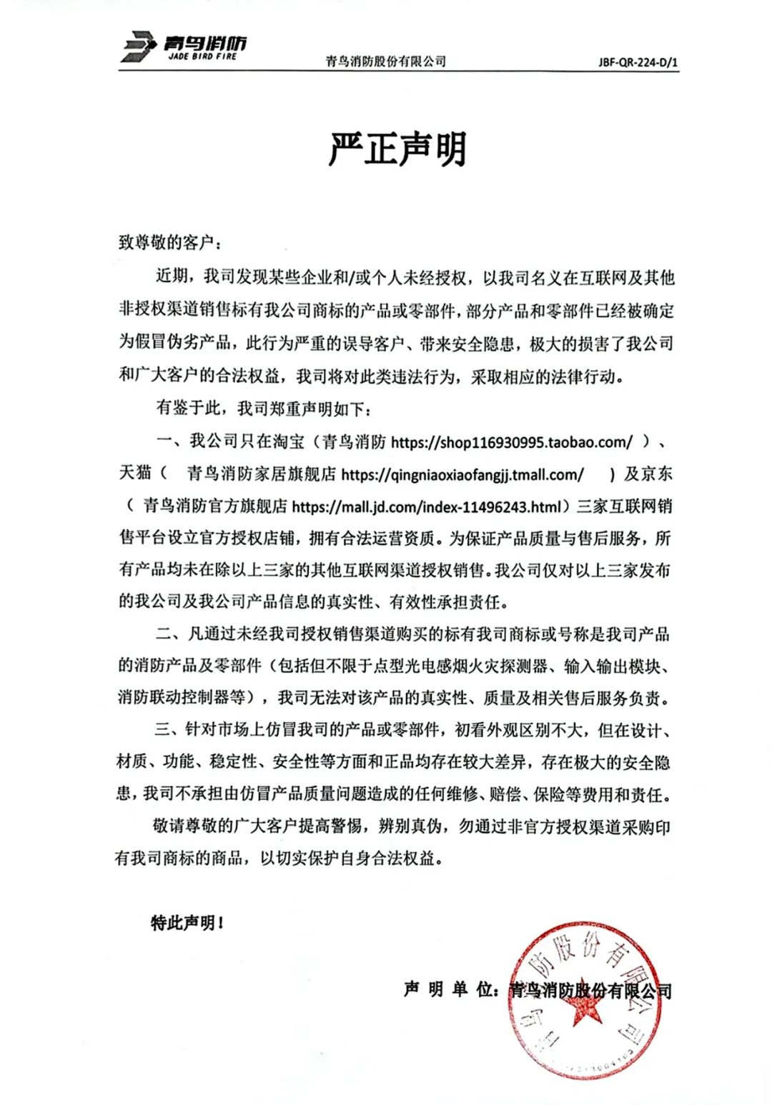 關于市場上仿冒青鳥消防產(chǎn)品的嚴正聲明